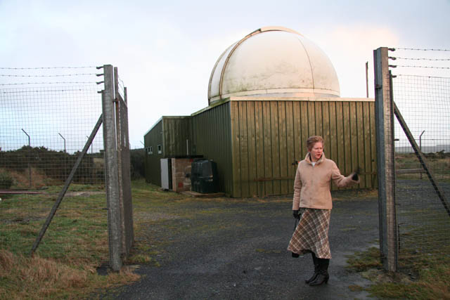 During New Year 2006/7 celebrations I visited friends who have recently moved to the Isle of Man. Many people will know this small island in the Irish Sea for its wide variety of scenery and terrain, and hosting of the annual Tourist Trophy motorbike races. But of particular interest to Astronomers is that most of the street lights on the Island are switched off between 2 am and 6 am every night! Even with the lights on, light pollution is relatively low, so the skies are dark and there is a flourishing Astronomical Society of around 150 members. On a previous visit I had seen from a distance an observatory on the Island, and when I found the Society via the Internet and made contact, they most kindly allowed me to visit on New Year's Day! The facility, entirely funded by the Society and friends, is well located with excellent views of the sky and a good distance from the major towns yet very accessible by road. Most impressive with a huge 20 foot diameter dome! My partner Carolyn gives scale here. If you are ever on the Island, it's worth contacting the Society. And have a look at their web site. |