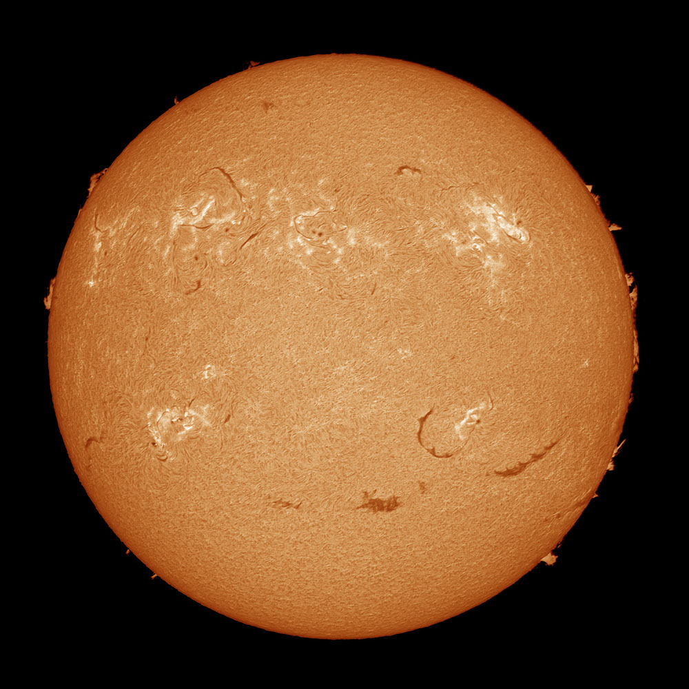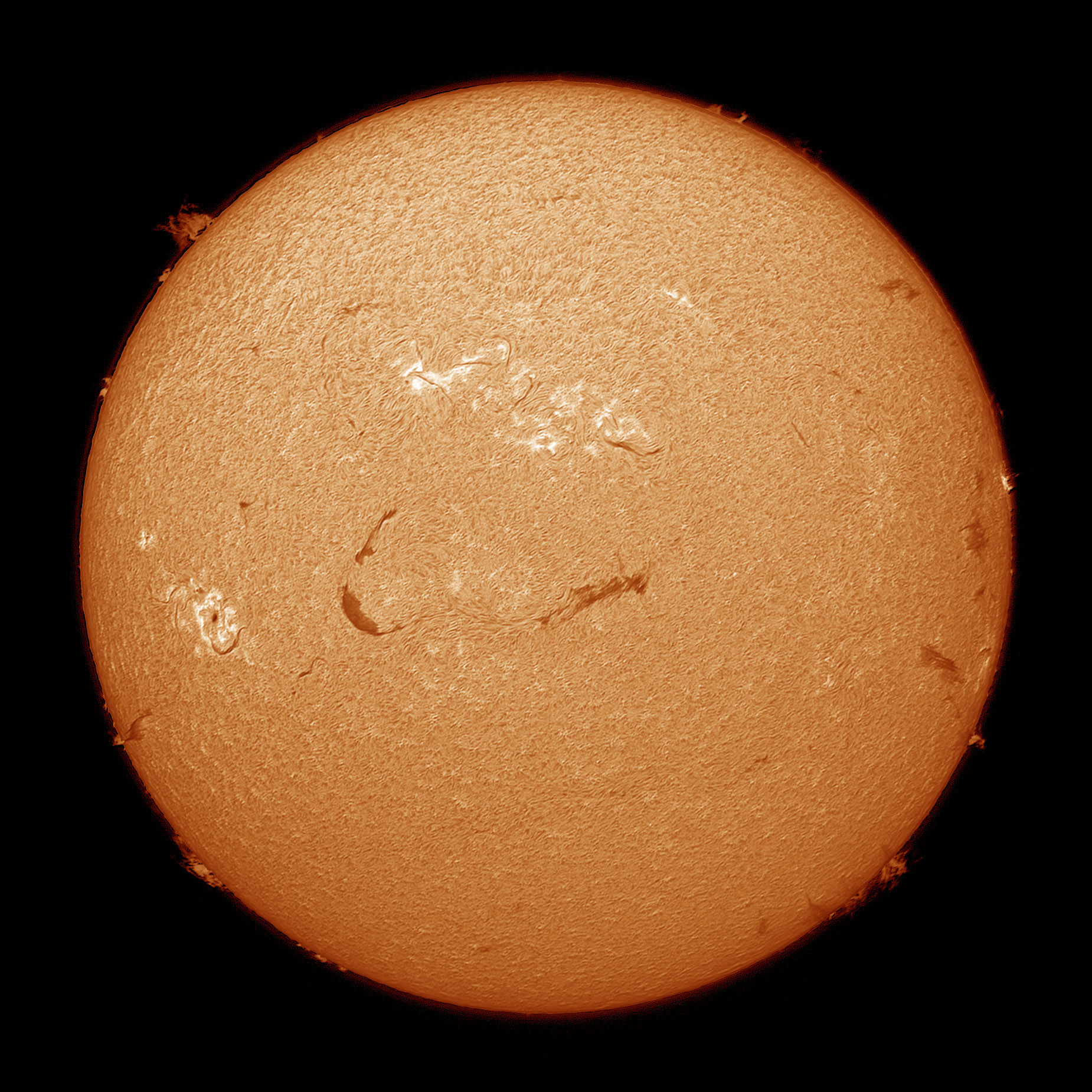 Another fine day and interesting prominences making it worth imaging. Acuter 40, 28 frames from 183 stack and initial process in Registax, finished in Photoshop. |