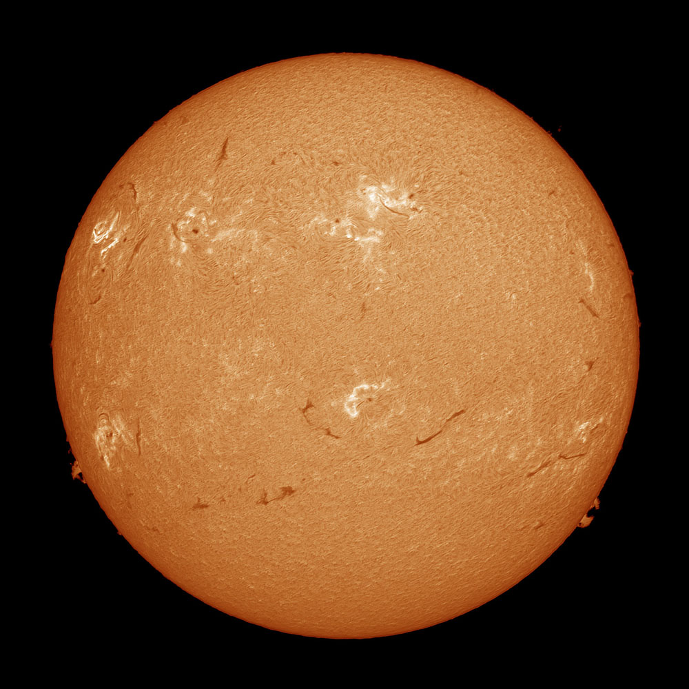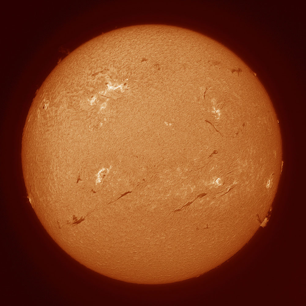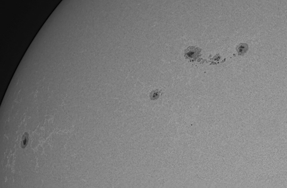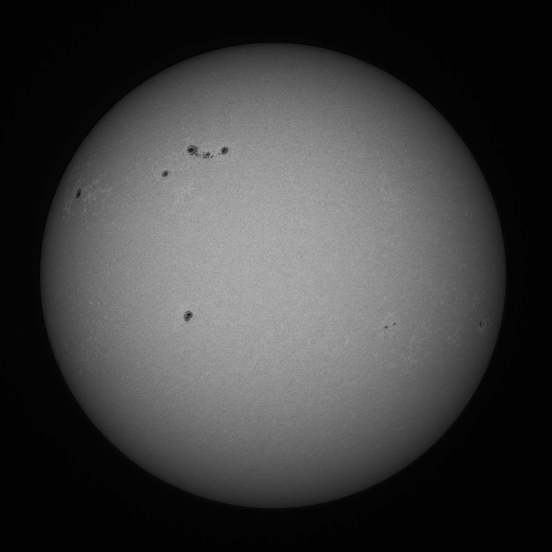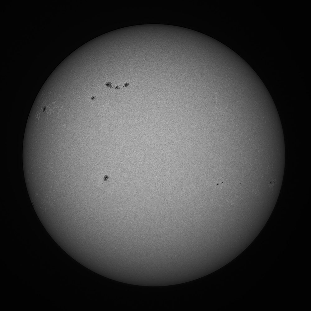 After many years of using Baader Solar Film for white light images, with the Acuter being an 'all in one' telescope, I finally invested in a 1 1/4 inch Herschel wedge which nicely fits in the carry case. Safer and more convenient than film. And this is an image taken with that system on 6th March 2025 . The wedge will just safely go on my TMB 105 which will give a crisper image and of course is a colour corrected triplet. Unfortunately because my nice TS65 Quad is of Petzval construction, direct sunlight could damage the built in flattener lens, so no wedge use there. As the Acuter is an achromat, I intend to use a colour, perhaps narrowband filter in future to improve definition. But this will do for a start. Full size |