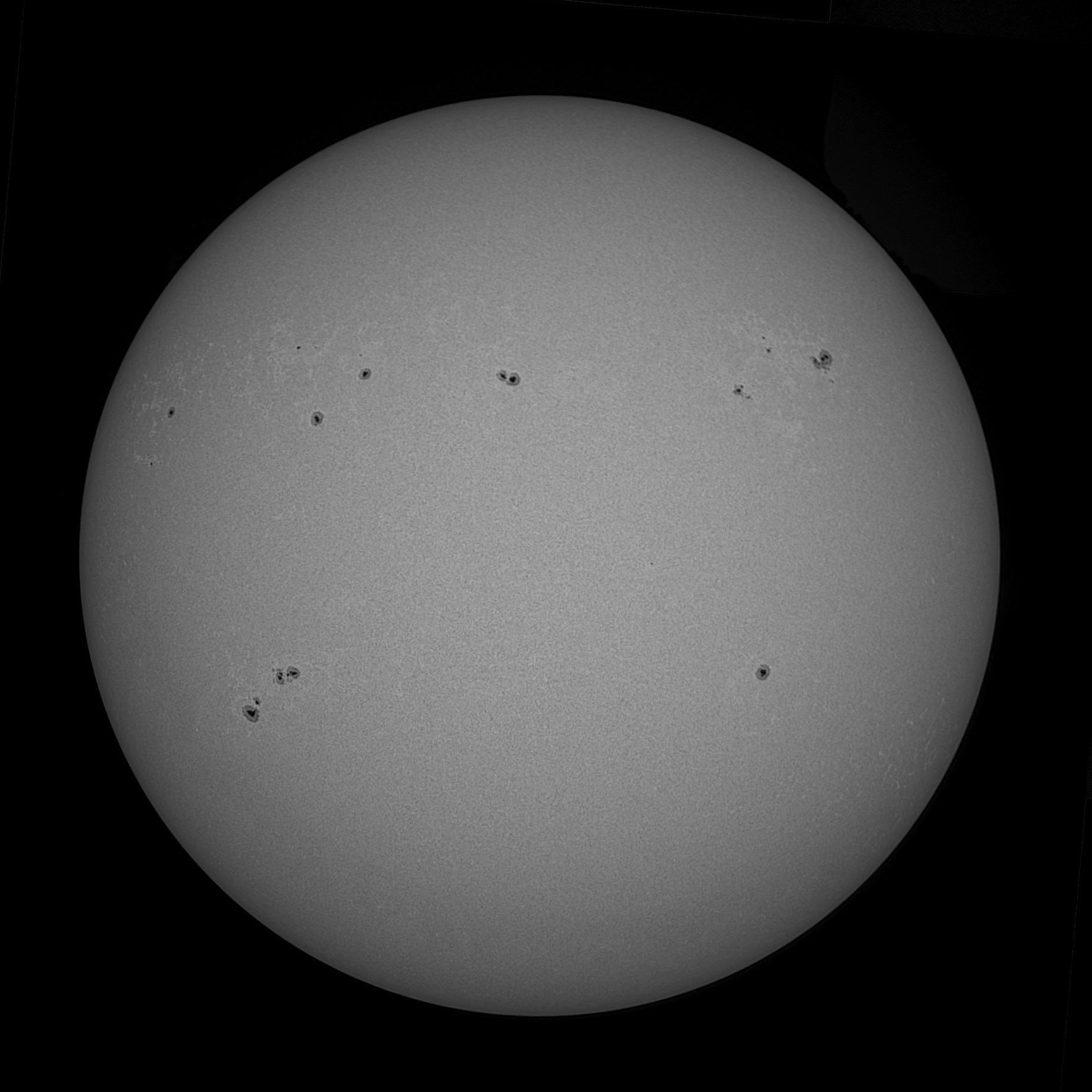 On May 1st 2025 (the day after I finished the NGC5754 image below), a filter which I had ordered arrived from Altair Astro. Its Solar Contrast Booster Filter, which is claimed to improve the definition of white light Solar images. As mentioned below I had recently purchased their 1.25" Herschel Wedge, and the filter seemed to be a suitable add on to further improve the images. The beautifully clear sky of the previous night continued into the afternoon, so more Solar fun, this time including the wedge and filter. There was a particularly large and active sunspot group, so worth closer attention. It had been suggested on Stargazers Lounge that the Acuter 40 could stand some magnification using a Barlow type magnifier. I already have a quite old 2x Barlow, and also by Televue a 2.5x Powermate and a 3x Barlow. Unfortunately it turned out that both the Televue items produced Newton's rings on Hydrogen-alpha images, but the older Barlow was ok. For white light all was well. So here we have a full Solar disc in both Hydrogen-alpha and white light, and sunspot closeups 2x H-a and 3x white light. All with the excellent Acuter Phoenix 40, the white light with the etalon unit removed and the blocking filter unit replaced by the Herschel Wedge and new filter on the camera, so using the full 80 mm aperture. In each case 20 to 30 frames from an avi of around 200 with the Altair 178M camera. I think there is some improvement in detail on the Hydrogen-alpha images, although given the limited 40 mm aperture this is always going to be problematical. Full size images here: White light spot (Mouseover the image for some interest) |