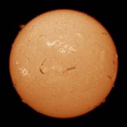 Sun Westering when the clouds cleared, so altitude only 15 degrees. But I knew there was a good prominence, so worth a go. Acuter 40, 33 subs from 107, processed in Registax and Photoshop. |