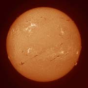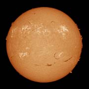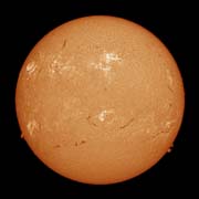 Viewing theSun in Hydrogen-alpha light requires the use of expensive precision filters. But of course ordinary white light is also of interest and easy to view safely using either specialised Solar film or a Herschel Wedge to dramatically reduce the brightness. I now have an Altair Astro Herschel Wedge - less prone to damage than Solar film and straightforward to use. And this is the result of using it on my Acuter 40 telescope with the H-a filter sets removed. I found that rather than completely removing the front adapter to reveal a full 80 mm aperture, the image was slightly crisper with it still in place giving a 50mm aperture. Probably due to the effective f8 ratio instead of the native f5. 30 frames from 191 with GPCAM3 178M stacked in Registax, final processing in Photoshop. As you can see there are numerous Sunspots which correspond to the active areas in the Hydrogen alpha image below. |