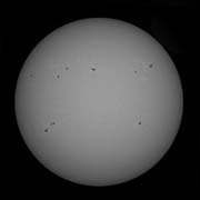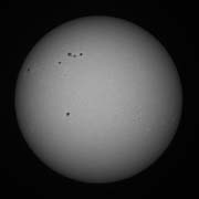 The seeing did not justify a close up, but the spots were worth a look. Acuter 40 hydrogen-alpha filters removed, so 80 mm objective, Altair 1.25" Herschel wedge, camera Altair 178M with Altair Solar contrast booster filter. 21 frames from 207. Full size. |