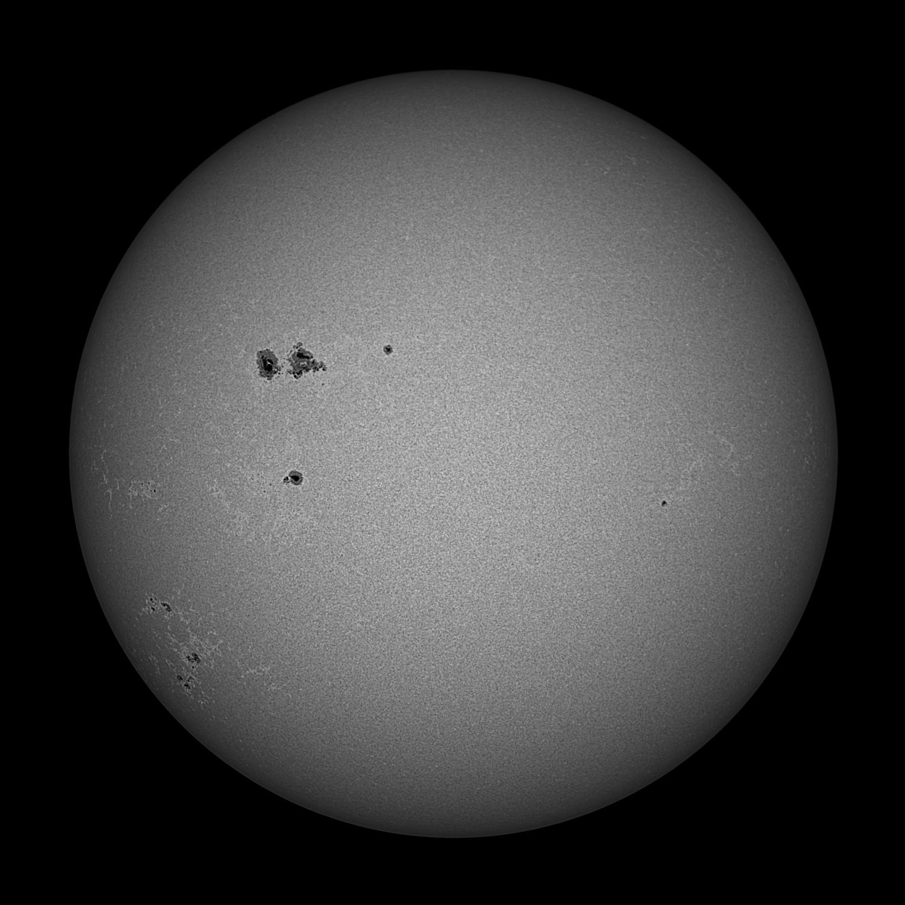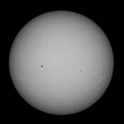 The seeing did not justify a close up, but the spots were worth a look. Acuter 40 hydrogen-alpha filters removed, so 80 mm objective, Altair 1.25" Herschel wedge, camera Altair 178M with Altair Solar contrast booster filter. 21 frames from 207. Full size. |