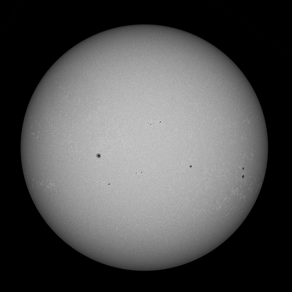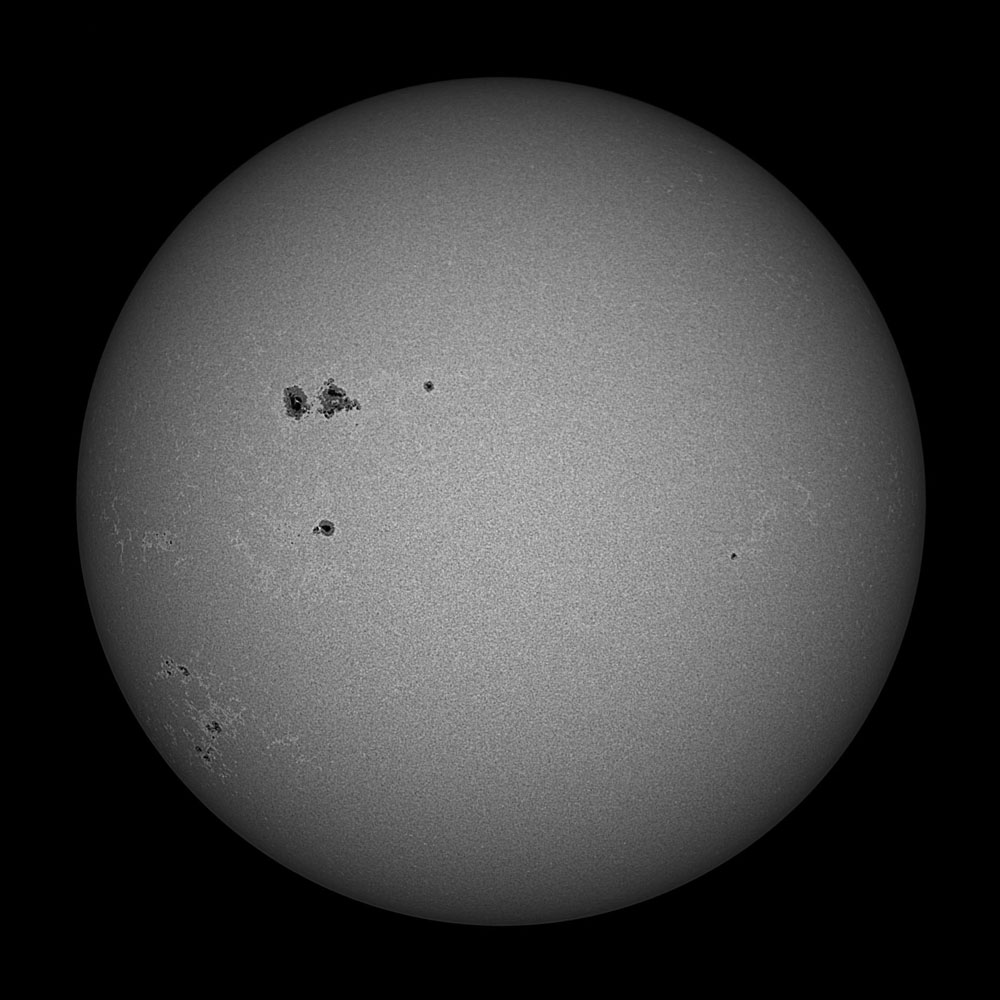 After many years of using Baader Solar Film for white light images, with the Acuter being an 'all in one' telescope, I finally invested in a 1 1/4 inch Herschel wedge which nicely fits in the carry case. Safer and more convenient than film. And this is an image taken with that system on 6th March 2025 . The wedge will just safely go on my TMB 105 which will give a crisper image and of course is a colour corrected triplet. Unfortunately because my nice TS65 Quad is of Petzval construction, direct sunlight could damage the built in flattener lens, so no wedge use there. As the Acuter is an achromat, I intend to use a colour, perhaps narrowband filter in future to improve definition. But this will do for a start. Full size |