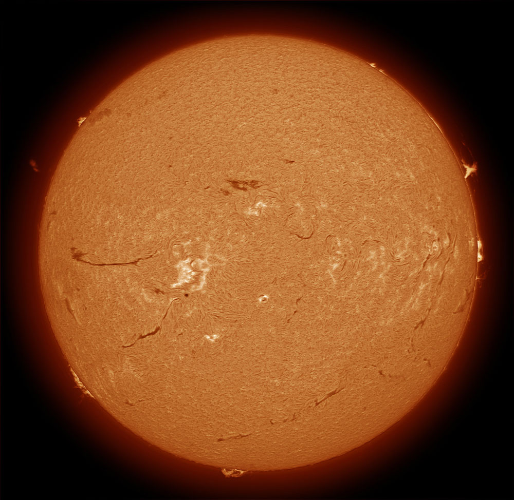 Another fine day and interesting prominences making it worth imaging. Acuter 40, 28 frames from 183 stack and initial process in Registax, finished in Photoshop. |