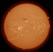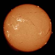 Digital Magic! When I was in Africa in 2001 for the Solar Eclipse, I was able to take a Hydrogen Alpha image of the Sun through a Coronado telescope belonging to a fellow camper. See Eureka Page. It showed prominences, although I was rather disappointed by the lack of surface detail. But now, on applying the techniques suggested by James Weightman in the July 2004 Sky and Telescope magazine, all is revealed! There is some vignetting from the lens system, barely noticeable in the original brighter image, but the majority of the frame is acceptable, and shows much more of the surface structure than was at first apparent. For anyone who has read the article, the Green channel was the one to use in this case.
