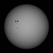 There were several small sunspots visible. Taken with a Solar filter of course (Baader film). Larger image |
