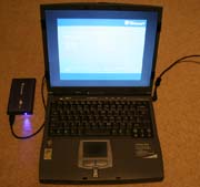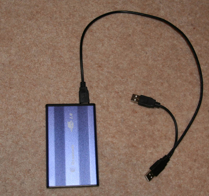 Like Crucial, Drive my Laptop have an extensive database to assist in selecting a suitable drive, and I soon decided on a Seagate 120GB unit. A 'cloning' kit was also purchased. This supplies a holder for a drive with a USB interface and appropriate software to map an exact copy of the original drive onto the new one. The two USB plugs are provided to plug in to two sockets to ensure sufficient power to run the drive |