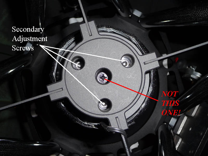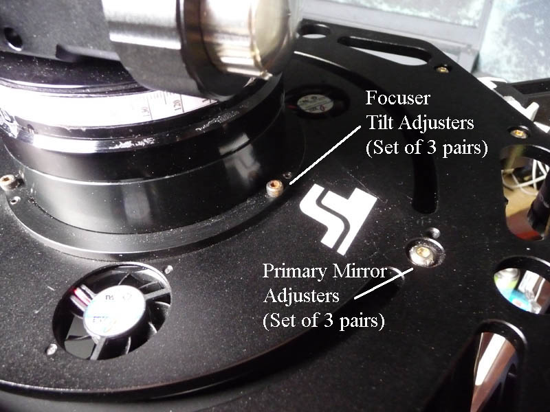 Because the primary adjustment screws are at the rear of the telescope, it is relatively easy to adjust them while looking through an eyepiece. IMPORTANT. My focuser is fitted directly to the backplate of the telescope via a tilt adjustment plate. But on some RC models from GSO the focuser is fixed to the mirror cell assembly. If that is the case, adjustment of the primary mirror will affect the alignment of the focuser, and it is then advisable to repeat the process from stage one. Unless the primary was initially well out of collimation, one repeat may be sufficient. |