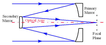 But reflecting telescopes, of which the GSO RC10 is one, need the collimation checking from time to time. The method can vary depending on the design - Newtonian, Schmidt Cassegrain, variations on those themes, and in this case Ritchey-Chrétien (RC). The RC design consists of two hyperbolic mirrors facing each other, a hole in the centre of the primary mirror allows light from the secondary to pass through to the eyepiece or camera., positioned at the focal plane where the image comes to focus: