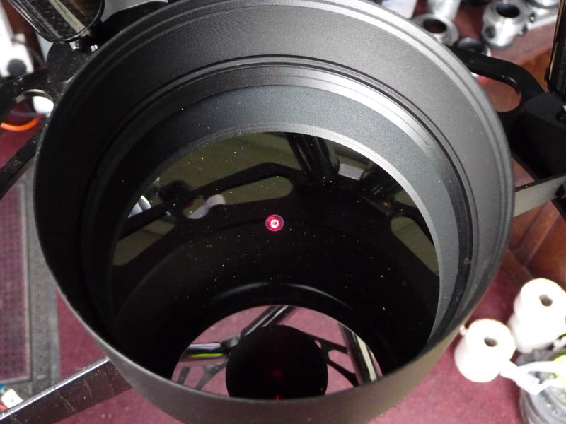 There are of course different approaches to collimating these telescopes, I am simply describing the method I use, which requires an accurate laser for the initial stages, and assumes that a tilt adjustment plate is fitted to the focuser. I always have the telescope facing vertically downwards so that the laser rests level on the focuser to prevent any tilt being created by using clamping screws. As always on these web pages, click on the thumbnail for a larger image. The cursor should change shape if a larger image is available.