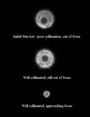If collimating through an eyepiece, what you are looking for is concentric rings around the slightly out of focus star which remain so as fine focus is approached. For best results a short focal length eyepiece should be used,with a Barlow lens if available. Whether collimating using a web cam or eyepiece, adjustments of the collimation screws will move the image towards the edge of the field of view, so it will be necessary to re-centre the star after each adjustment using the mount controls, assuming a driven mount for a telescope of similar size and focal length. |