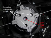 The first stage is to align the focuser with the secondary mirror. The laser is placed in the focuser, and the tilt of the focuser adjusted using the push-pull screws on the focuser tilt adjustment plate until the dot from the laser is exactly centred on the central mark of the secondary mirror. If possible have the focuser at or near the setting normally used for visual or imaging, depending on the main use of the telescope. |