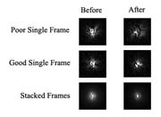 It is possible using a laser with an accurately etched 'holographic' reticle to adjust the primary mirror for final alignment, but in my case I prefer to do the final collimation stage using a star near the zenith. I use a web cam with the excellent freeware program Metaguide. With the star focused, atmospheric effects make it difficult to see exactly what is happening. But Metaguide combines several frames to produce a clearer image, This picture gives some idea of what can be seen before and after collimation. The test star doesn't want to be too bright, around second magnitude is usually suitable, but the higher in the sky the better to minimise atmospheric distortions. |