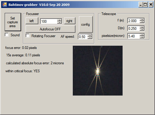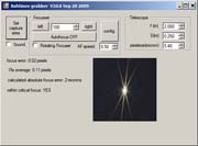 Bahtinov Grabber is a very useful program written by Niels Noordhoek. It analyses the diffraction pattern produced by a Bahtinov Mask and indicates best focus. Very quick and easy to use, particularly if (perhaps by using Regions of Interest for the subject star) the sequential frame captures can be kept short. Sadly Nils passed away in October 2012, but the free program is still available in various versions. I have put all the versions I have been able to find in this zip file (only 154 KB). It contains 32 and 64 bit versions of the program with and without the autofocus option, including the original. No special installation required, just extract an .EXE file from the zipped folder, put it in a suitable location and run it. Worth trying more than one version to see which you prefer. |