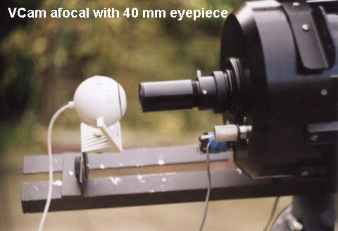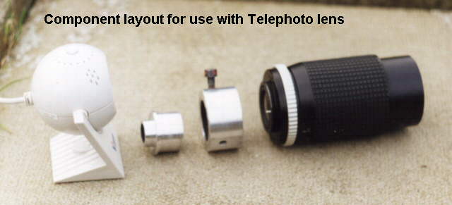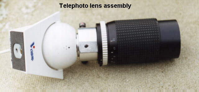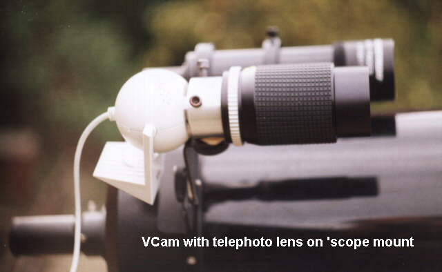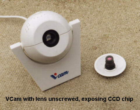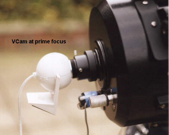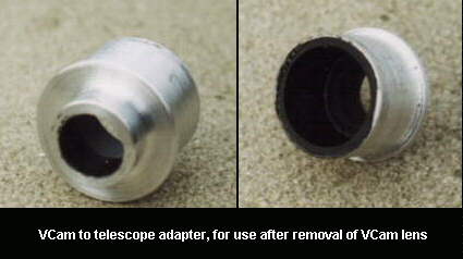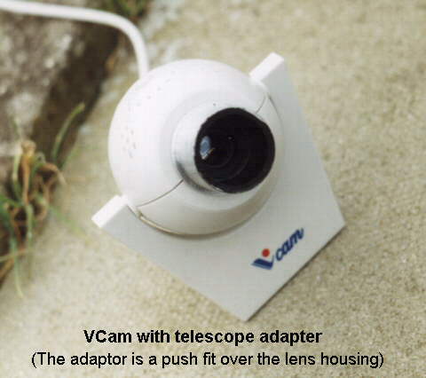 In January 2000, I bought a VCam Web camera which gave me a lot of pleasure, but also some frustration. The USB port camera is simple to operate, but the exposure range is very limited, so it's useless for deep space objects. But very nice for the Solar System, particularly the Moon, as witness the Photo Gallery images. The lens screws right out, exposing the CCD chip. And the lens housing is perfect for fitting a (home made) adapter for use with the telescope in the same way as an eyepiece, without having to open the camera case. Technical details are also available (in French!) on the Astrocam Web Site.